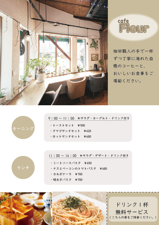 架空のカフェのチラシの裏面です。